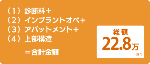 | ※1上部構造の種類によって支払総額は異なります。 ※骨が足りないなどの場合別途骨を再生させる処置が必要になることがあります。 |